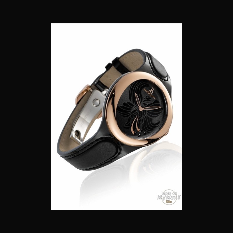 | + More characteristics : | Boîtier en acier inoxydable & en or rose 5N. 18 carats (lunette avec couronne plaquée). Finition poli miroir. Cadran noir opalin mat avec un décor fleur verni. serti de 4 diamants noirs (0.03 carat). Autonomie de la pile ≈ 3 ans. |