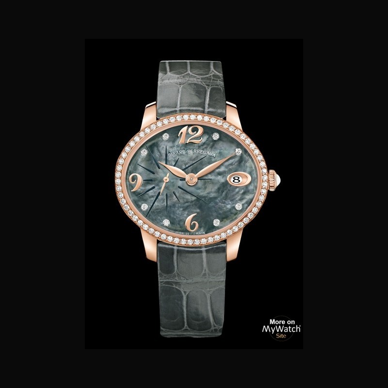 | More characteristics : | Movement Calibre: 11 ½’’’ J28 jewels Frequency: 28.800 vibrations/hour (4 Hz) Power reserve: minimum 46 hours Oscillating weight in pink gold delicately engraved with a motif in the form of the letters “GP” Case set with 62 diamonds (approx. 0.85 carats) Sapphire case-back closed by 4 screw Alligator strap with folding or ardillon buckle Also available with a white gold case And/or dark mother of pearl dial |