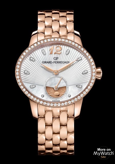 | More characteristics : | Movement Diameter: 25.60 mm (111/2 ’’’) Frequency: 28.800 Vib/h - (4 Hz) Power reserve: min. 46 hours Jewels: 32 Functions: hour. minute. small second. day/night indicator Case in pink gold Case-back: sapphire crystal. secured by 4 screws Setting Bezel: 62 brilliant-cut diamonds ~ 0.80 ct Dial: 18 brilliant-cut diamonds ~ 0.60 ct Pink gold bracelet Pink gold folding clasp |