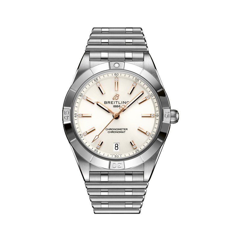 | More characteristics : | Movement Caliber: Breitling Caliber 10 Diameter: 25.60 millimeters Depth: 3.60 millimeters Winder: self-winding mechanical, bidirectional with ball bearing Power reserve: approx. 42 hours Balance frequency: 28,800 a/h or 4 hertz Case Stainless steel Dial White Bracelet / Buckles Stainless-steel Rouleaux bracelet with butterfly clasp |