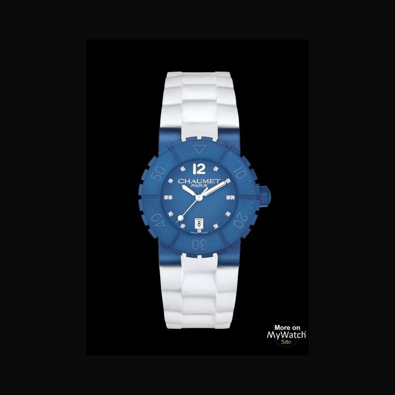 | More characteristics : | Case Engraved numeral markers. 6 embossed fine-brushed markers Grade 2 blue titanium. fluted. double-security screwed Dial Rhodium luminescent applied Arabic numeral “12” 11 brilliant-cut diamond markers Rhodium-plated applied “Chaumet Paris” logo and date window contour White date disc with black numbers 13 diamonds – 0.05 ct Strap Second strap offered Grade 2 blue titanium folding buckle. fine-brushed stainless steel push-buttons and blades. engraved with “Chaumet Paris” logo |