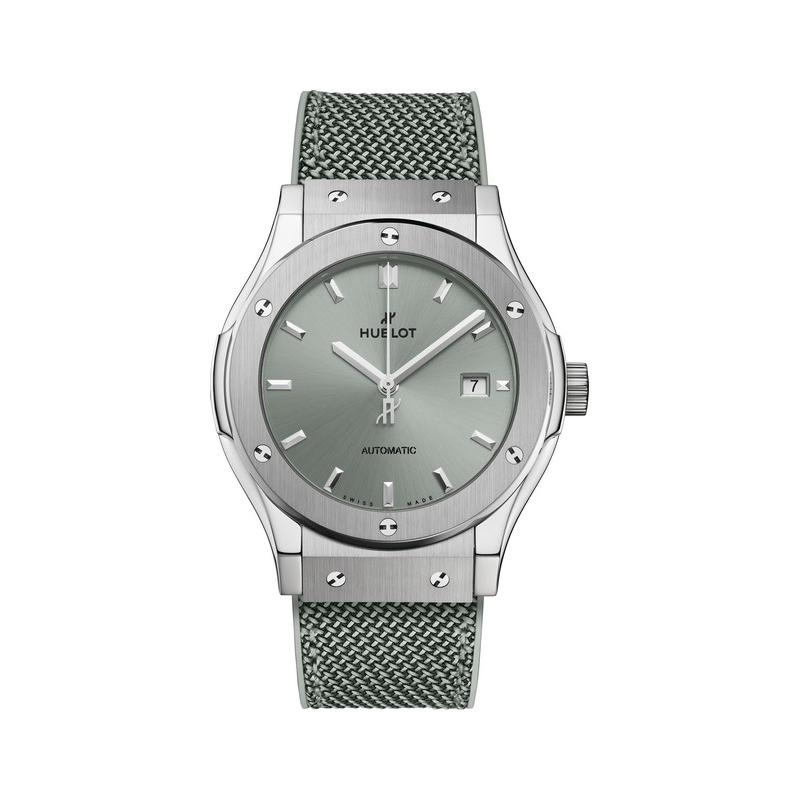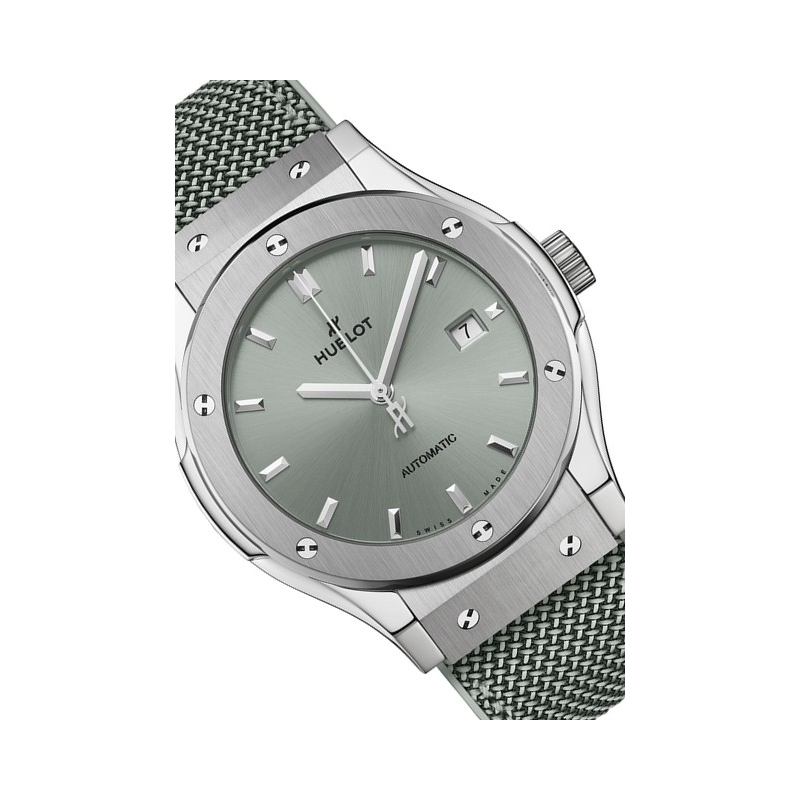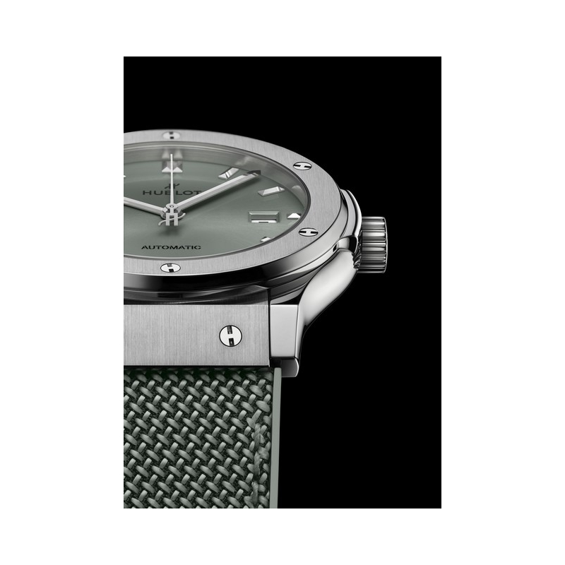The second version has a diameter of 42 mm. Its sage green beauty is on full display: three central hands, a date window at 3 o'clock and nothing more from this minimalist design aligned with nature in its most essential form. As with every model, the sage green sunray finished dial blends naturally with the rubber strap and fabric insert in the same shade, specially developed for these three new references. Aligned with Hublot’s way of doing things differently, with a subtle twist reminiscent of Milanese mesh: its 3D threads are woven at a 45° angle, producing a slightly asymmetrical effect in relation to the case’s profile. A feature of all three models, this is an offbeat touch that adds soul. The unisex version is powered by an automatic movement with a 48-hour power reserve.