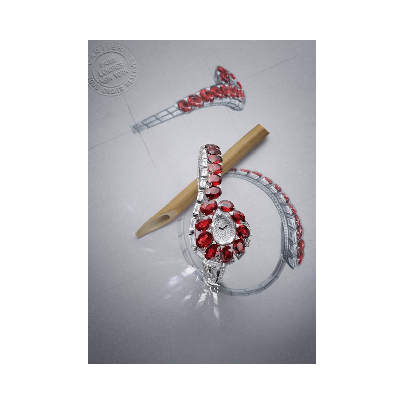 This Cartier evening watch was inspired by a set of 15 rubies. A glittering accessory designed for the dawdling hours of the day, dusk descends yet the fire of the gemstones appears to ignite. The 15 rubies, with a total weight of 24.93 carats, exhibit a remarkably uniform colour: an intense deep red with a diamond-like sparkle partnered by the orangey-pink hue specific to Mozambican rubies.