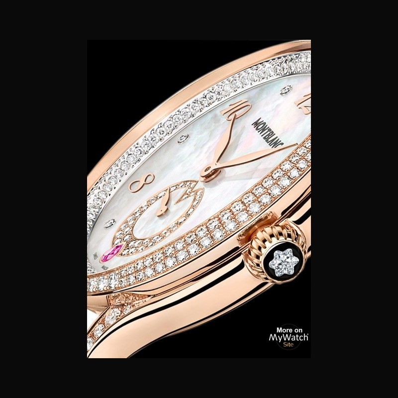 Each of the twenty-nine wristwatches that together comprise the limited edition of the Montblanc ‘Collection Princesse Grace de Monaco’ has an eighteen carat red gold case studded with gems weighing a total of 1.47 carat and is affixed to an alligator-leather strap. The bezel is embellished with 126 brilliant-cut diamonds set in two rows along the sides and arranged in a single row between the horns to form a sparkling oval that’s echoed by 130 brilliant-cut diamonds along the flange around the dial. Additional gems adorn the horns, six diamonds serve as indices to mark the hours, and forty-five brilliant-cut diamonds surround the seconds subdial as though they were a necklace with a pink sapphire pendant. On this wristwatch too, Montblanc’s trademark is eternalized in the form of a diamond in the crown.