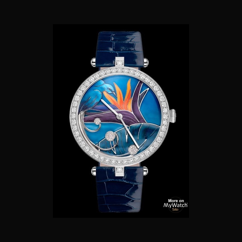 | More characteristics : | Numbered edition Self-winding mechanical movement with a 24-hour module developed exclusively for Van Cleef & Arpels White gold case. bezel set with diamonds Case back: engraved gold with motifs echoing the story of the dial Dial: cloisonné enamel. engraved gold and diamonds Over-dial: champlevé enamel. sculpted gold and diamonds Navy blue alligator strap. white gold pin buckle set with diamonds |