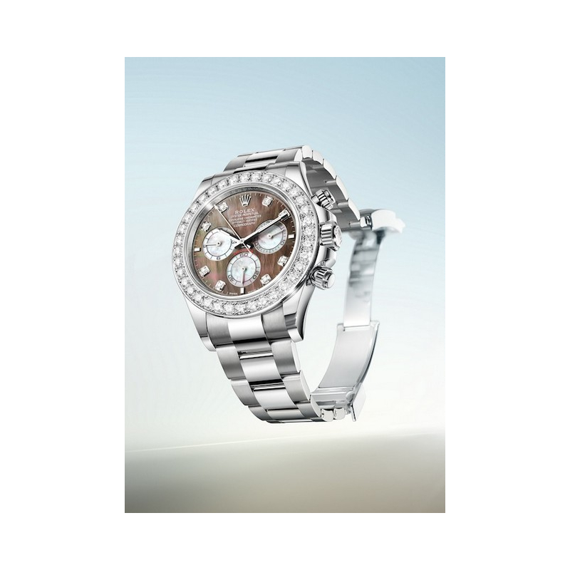 Rolex is unveiling two new precious and exclusive versions of the Oyster Perpetual Cosmograph Daytona distinctive for their contrasting dial made from natural mother-of-pearl and graced with eight diamonds and three Chromalight hour mark- ers. Both watches are crafted in 18 ct white gold and crowned with a bezel set with 36 brilliant-cut diamonds.