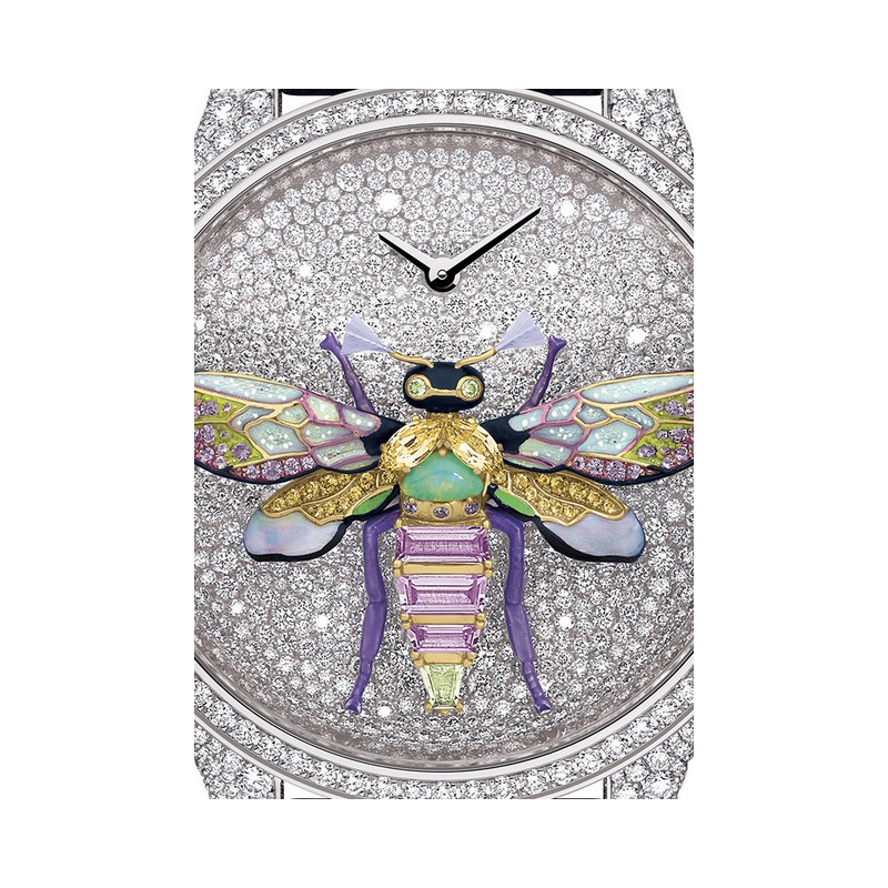 | More characteristics : | Movement Quartz Off-centre movement at 12 o’clock Case White gold paved with snow-set round-cut diamonds Dial White gold paved with snow-set round-cut diamonds, decorated with a yellow gold bee, set with baguette-cut pink sapphires, roundand marquise-cut yellow sapphires, round- and baguette-cut peridots, round-cut amethysts and adorned with opals and feathers Strap / Buckles Black velvet strap with a white gold prong buckle snow-set with round-cut diamonds Extra black satin strap COMPOSITION 750/1000 palladium 210 white gold and 750/1000 yellow gold / Weight (average): 76.73g Diamonds: 1 864 / Carats (approx.): 9.92 / Clarity: IF-VVS / Colour: FG Pink sapphires: 3 / Carat (approx.): 0.31 Yellow sapphires: 24 / Carat (approx.): 0.18 Amethysts: 47 / Carat (approx.): 0.07 Peridots: 3 / Carat (approx.): 0.06 Swiss made |