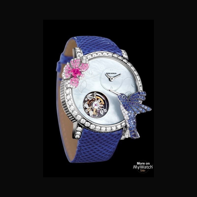 | More characteristics : | Movement Flying tourbillon with Swiss escapement lever Additional module to ex-center the hour and minute hands at 1 o’clock Dimensions: 13 (30mm) Frequency : 3 Hz 17 jewels Power reserve: approx.. 100 hours Bridges manually angled in B shape Case Thickness (without animal): 16.6 mm Sapphire crystal with anti-reflective treatment on the inner side of the glass Sapphire glass opened on the movement on the backcase Bezel and hornes: 49 diamonds Colibri and flower in white gold Total 242 stones: 65 diamonds 28 pink sapphires 149 blue sapphires Dial White mother of pearl dial with flower decoration engraved by hand Steel hands Blue karung strap White gold pin buckle with “Clous de Paris” pattern Total weight of stones 291 stones: approx.. 5.9 carats |