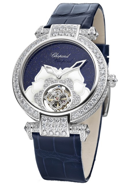 | More characteristics : | Movement Mechanical self-winding movement L.U.C 96.24-C Winding via a diamond-set platinum micro-rotor Number of components 194 Total diameter 27.40 mm Thickness 3.30 mm Number of jewels 25 Frequency 25,200 vph (3.5 Hz) Power reserve 65 hours Case Ethical 18-carat white gold Dial Blue aventurine dial with IMPERIALE flower-shaped tourbillon set with diamonds and mother-of-pearl Strap / Buckles Strap in shiny blue alligator leather Pin buckle in ethical 18-carat white gold set with diamonds Eight-piece limited edition |