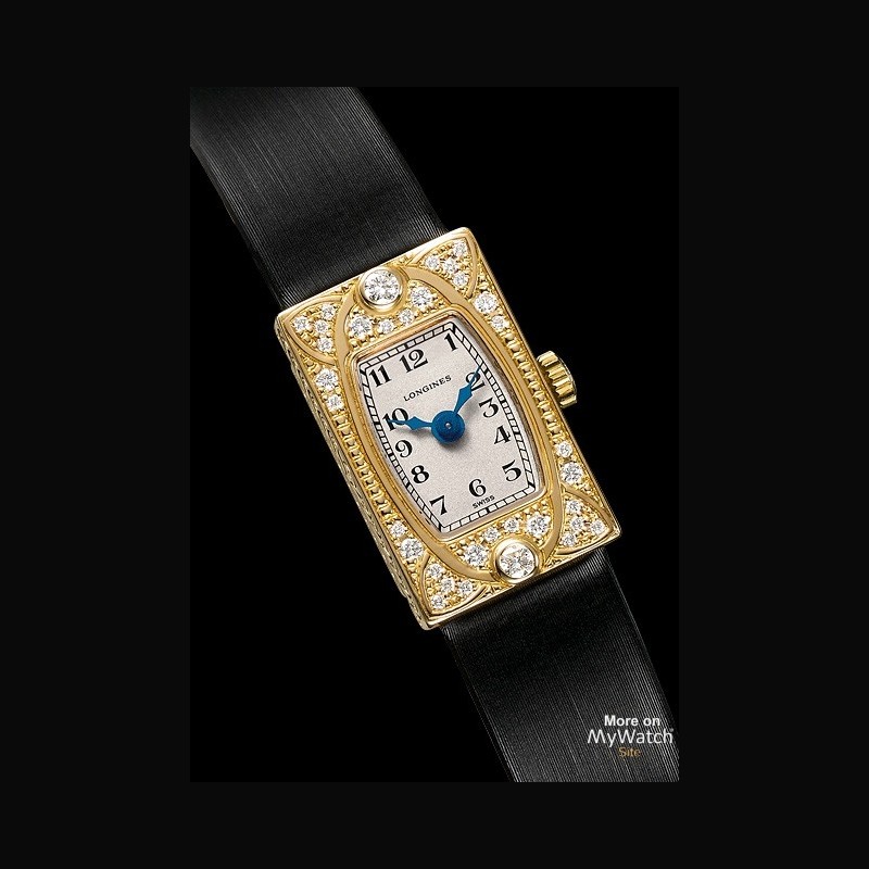| + More characteristics : | Movement Caliber Longines proprietary dating from the 1970s 5¾ lines 17 jewels Frequency : 21.600 vibrations per hour Power reserve of 28 hours Case 18K yellow gold case Set with 34 diamonds Top Wesselton VVS (0.309K) Case and case back decoration engraved by hand Reproduction of a Longines jewellery watch from the 1920s |