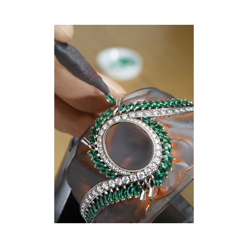 The sensual curves of the Limelight Gala are accentuated by a row of 91 brilliant-cut diamonds (approx. 5.28 cts.) that circle the bezel, lugs, and bracelet. Piaget has added a spectacular row of 83 marquise-cut eme- ralds (approx. TBC) to this line of sparkling diamonds, creating a sense of movement across the timepiece, and bringing out the deep green hues of the opal dial. The marquise cut was named after the French Marquise de Pompadour for whom Louis XV had created a specific gem-cut in the shape of her lips. Since the 1960s, Piaget has of- ten worked with this feminine and sensual cut to accentuate the femininity of its crea- tions. Each marquise-cut gemstone is held in place by a delicate claw-setting that testi- fies to Piaget’s extraordinary high-jewellery expertise. The timepiece is powered by the Maison’s 56P quartz movement.