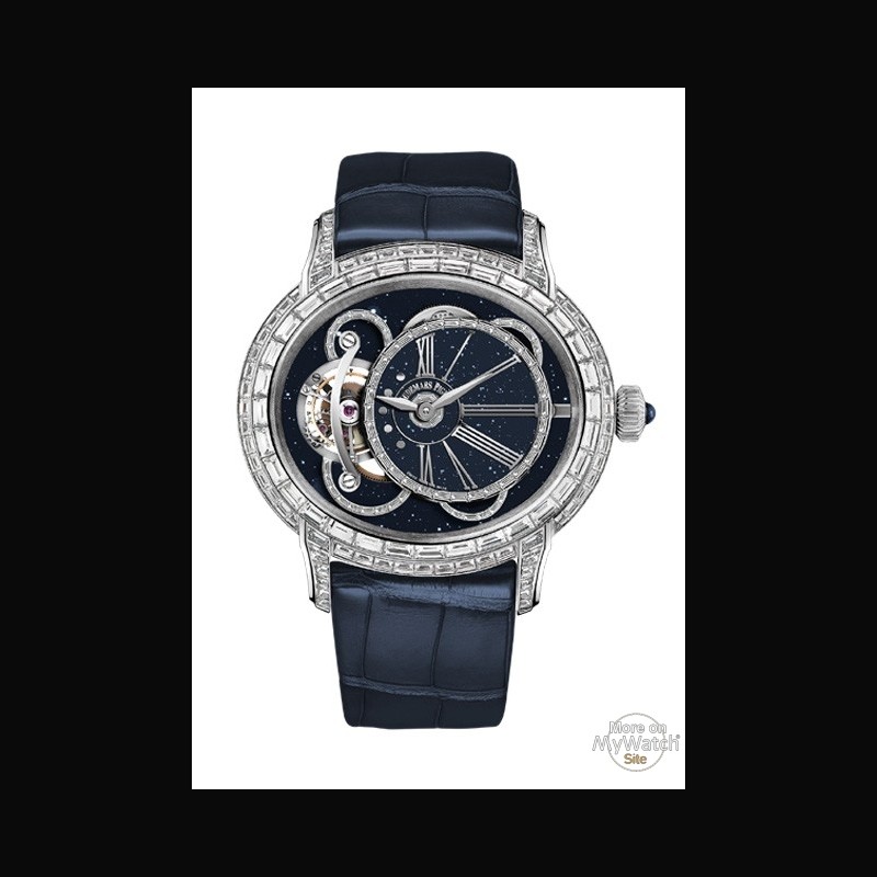 | More characteristics : | MOVEMENT Hand-wound Manufacture Calibre 2938 Total dimensions: 35.10 x 30.10 mm (15 1/2 x 13 1/4 lines) Total thickness: 7.10 mm Number of jewels: 19 Number of parts: 187 Minimal guaranteed power reserve: 72 h Frequency of balance wheel: 3 Hz (= 21.600 vibrations/hour) CASE 18-carat white gold case. entirely set with baguette-cut diamonds. glareproofed sapphire crystal and caseback DIAL Blue aventurine dial White gold rings set with baguette-cut diamonds White gold applied Roman numerals and points BRACELET “Large square scale” blue alligator strap 18-carat white gold AP folding clasp set with baguette-cut diamonds GEMSETTING Case ad buckle: 205 baguette-cut diamonds ~10.52 carats Dial: 86 baguette-cut diamonds ~0.68 carats |