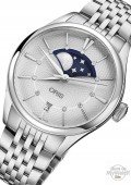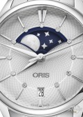 | + More characteristics : | Movement Automatic Oris Cal 763 based on Sellita SW 220-1 with ‘grande lune’ moon phase display at 12 o’clock, and date at 6 o’clock Quick moon phase adjustment system operated through crown at 3 o’clock Case Multi-piece stainless steel case Screwed stainless steel case back with see-through mineral glass Double-domed sapphire crystal with anti-reflective coating inside Dial Silver guilloché dial with 11 full-cut diamond hour markers (0.042 carat, full cut, Si, colour H) and applied indices Strap / Buckles Stainless steel bracelet stainless steel folding clasp Also available with midnight blue or black leather strap with stainless steel folding clasp. |