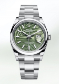 | More characteristics : | Movement Calibre 3235, Manufacture Rolex Mechanical movement with bidirectional self-winding via Perpetual rotor Precision: −2 /+2 sec/day, after casing Frequency: 28,800 beats/hour (4 Hz) Paramagnetic blue Parachrom hairspring Rolex overcoil Large balance wheel with variable inertia High-precision regulating via four gold Microstella nuts Traversing balance bridge High-performance Paraflex shock absorbers Escapement: Chronergy with optimized energy efficiency Paramagnetic nickel-phosphorus pallet fork and escape wheel Jewellin: 31 rubies Power reserve: Approximately 70 hours Centre hour, Minute and seconds hands, Instantaneous date at 3 o’clock with secure rapid-setting Case Oystersteel Oyster (monobloc middle case, screw-down case back and winding crown) Bezel Oystersteel domed Case back Oystersteel solid with fine fluting Winding crown Twinlock in Oystersteel with double waterproofness system Dial Olive green, gloss, palm motif Hour markers in 18 ct white gold, Highly legible Chromalight (long-lasting luminescence blue glow) Hands in 18 ct white gold, Highly legible Chromalight (long-lasting luminescence blue glow) except the seconds hand Bracelet / Buckles Oyster, three-piece solid links Oystersteel, polished centre links, satin-finished outer links with polished edges Folding Oysterclasp Easylink comfort extension link (approx. 5 mm) Certification Superlative Chronometer (COSC + Rolex certification after casing) International five-year guarantee |