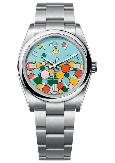 Alive with colour, vitality and positivity, the new lacquered dial of the Oyster Perpetual in 31 mm, 36 mm and 41 mm is dotted with many-coloured bubbles that joyfully reunite the five hues introduced to the range in 2020.