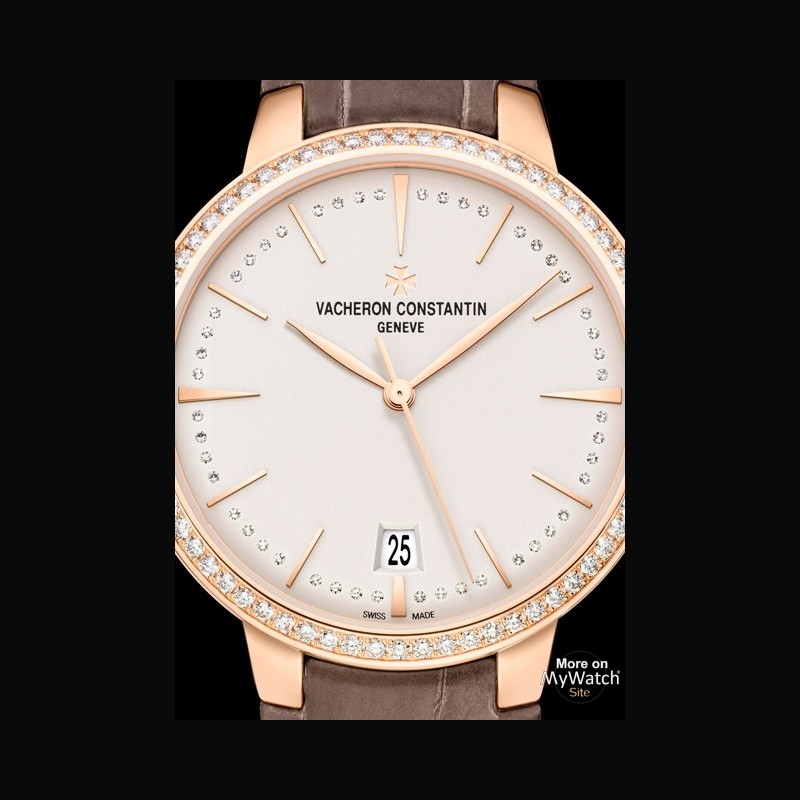 | More characteristics : | Movement Caliber 2450 Q6 Developed and manufactured by Vacheron Constantin 26.2 mm (11’’’¼) diameter. 3.6 mm thick Approximately 40 hours of power reserve 4Hz (28.800 vibrations/hour) 196 components 27 jewels Indications Hours. minutes. center seconds. date at 6 o’clock Case 18K 5N pink gold Diamond-set bezel (68 round-cut diamonds) Diamond-set crown (1 diamond) Dial Silvered opaline. convex external zone Diamond-set minute-track (48 round-cut diamonds) 18K 5N pink gold applied hour-markers Bracelet Light blue Mississippiensis alligator leather. hand-stitched stitched-tip. saddle-finish. square scales 18K 5N pink gold buckle folding clasp Polished half Maltese cross-shaped Total diamond-setting 117 round-cut diamonds for a total weight of approx. 1 carat |