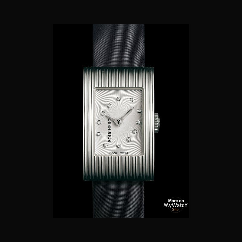 | More characteristics : | Polished steel case with gadroons Stamped silver dial with sunray effect set with 12 diamonds in an ellipse and “26. Place Vendôme” signature at 6 o’clock Interchangeable steel or gold bracelets and leather or fabric straps |