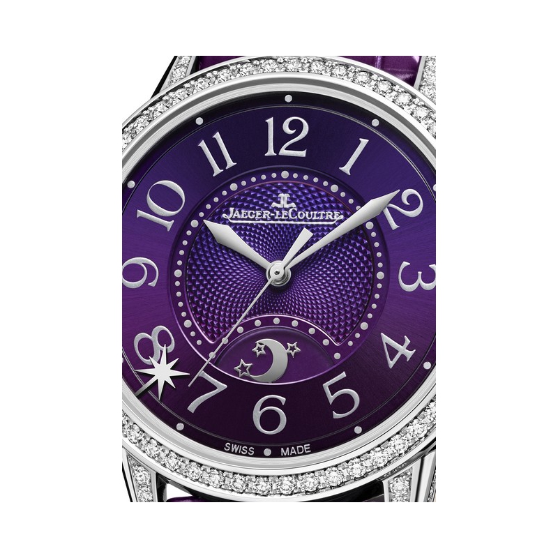 | More characteristics : | Movement Automatic mechanical movement Jaeger-LeCoultre Calibre 735 produced assembled and decorated by hand 28 800 vibrations per hour 40-hour power-reserve 286 parts 40 jewels 5.57 mm in height Case White gold Crowns 1 crown to move the star and set the desired rendez-vous time when the watch is due to chime 1 crown to adjust the hours and minutes and the night and day indicator Dial Amethyst colour guilloche and grained dial Bezel horns case side set with diamonds inverted diamonds on the crowns Hand Floral Strap / Buckles Alligator leather strap with a folding buckle interchangeable system strap |