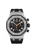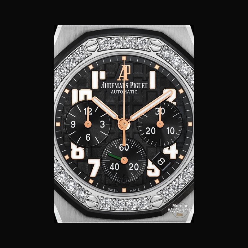 | More characteristics : | MOVEMENT Total diameter : 26.20 mm (11½ lines) Movement thickness : 5.50 mm 37 jewels 304 parts Minimum guaranteed power reserve : 40 hrs Cadence of the balance : 21.600 vph CASE Stainless steel case (37 mm). Case-back engraved with Ladycat logo. Royal Oak Offshore logo and the inscription “Limited Edition”. gemset bezel and studs black rubber-moulded screw-locked crown and pushers. DIAL Black dial with “Méga Tapisserie” pattern. applied numerals and Royal Oak hands in pink gold with luminescent coating STRAP Black rubber strap with stainless steel AP folding clasp.white gold AP folding clasp. |