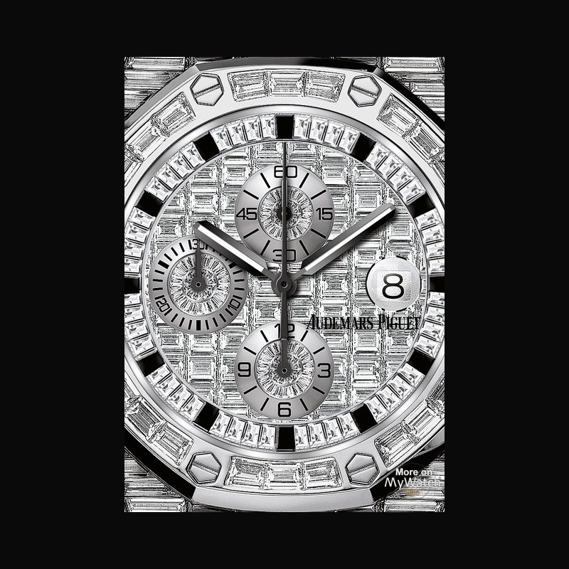 | More characteristics : | MOVEMENT Selfwinding Manufacture Calibre 3126/3840 Total diameter: 29.92 mm (13 1/4 lines) Total thickness: 7.16 mm Number of jewels: 59 Number of parts: 365 Minimal guaranteed power reserve: 50 h Frequency of balance wheel: 3 Hz (= 21.600 vibrations/hour) CASE 18-carat white gold case Entirely set with baguette-cut diamonds Glareproofed sapphire crystal and caseback Screw-locked crown set with baguette-cut diamonds DIAL 18-carat white gold dial Paved with baguette-cut diamonds Gold Royal Oak hands with luminescent coating White gold with baguette-cut diamonds and baguette-cut onyx BRACELET Hand-stitched “large square scale” black alligator strap 18-carat white gold AP folding clasp set with baguette-cut diamonds GEMSETTING Case and buckle 159 baguette-cut diamonds ~16.65 carats Dial 88 baguette-cut diamonds ~4.80 carats (dial) Inner bezel 48 baguette-cut diamonds ~1.41 carats 12 baguette-cut onyx ~0.29 carats |