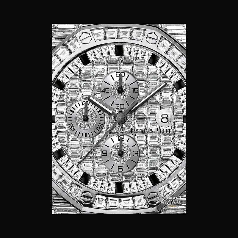 | More characteristics : | MOVEMENT Selfwinding Manufacture Calibre 3126/3840 Total diameter: 29.92 mm (13 1/4 lines) Total thickness: 7.16 mm Number of jewels: 59 Number of parts: 365 Minimal guaranteed power reserve: 50 h Frequency of balance wheel: 3 Hz (= 21.600 vibrations/hour) CASE 18-carat white gold case Entirely set with baguette-cut diamonds Glareproofed sapphire crystal and caseback Screw-locked crown and pushpieces set with baguette-cut diamonds DIAL 18-carat white gold dial Paved with baguette-cut diamonds Backened gold Royal Oak hands with luminescent coating White gold inner bezel set with baguette-cut diamonds and baguette-cut onyx BRACELET Hand-stitched 'large square scale' black alligator strap 18 carat white gold AP folding clasp set with baguette-cut diamonds GEMSETTING Case and buckle 165 baguette-cut diamonds ~14.89 carats Dial 110 baguette-cut diamonds ~6.53 carats Inner bezel 48 baguette-cut diamonds ~1.75 carats 12 baguette-cut onyx ~0.36 carats |