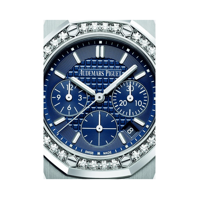 | More characteristics : | Movement Selfwinding manufacture Calibre 2385 Total diameter 26.20 mm (11 ½ lignes) Total thickness 5.50 mm Number of jewels 37 Number of parts 304 Minimal guaranteed power reserve 40 h Frequency of balance wheel 3 Hz (=21,600 vibrations/hour) Dial Blue dial with “Lady Tapisserie” pattern Blue counters Blue external zone White gold applied hour-markers Strap / Boucles Blue rubber strap with stainless steel AP folding clasp Additional blue rubber strap |