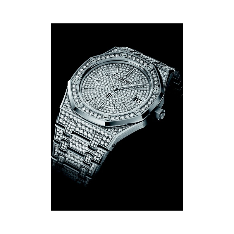 | More characteristics : | Movement Selfwinding manufacture Calibre 2121 Total diameter 28.40 mm (12 ½ lignes) Total thickness 3.05 mm Number of jewels 36 Number of parts 247 Minimal guaranteed power reserve 40 h Frequency of balance wheel 2.75 Hz (=19,800 vibrations/hour) Functions Hours, minutes and date Case Diamond-set 18-carat white gold case Dial Diamond-set 18-carat white gold dial White gold applied hour-markers and Royal Oak hands with luminescent coating Bracelet / Buckles Diamond-set 18-carat white gold bracelet with AP folding clasp |