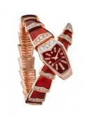 | + More characteristics : | Swiss quartz movement personalised for Bulgari. Calibre B033 26mm pink-gold curved case set with 6 brilliant-cut diamonds (0.46 cts). Red-lacquered dial set with 33 brilliant-cut diamonds (0.054 cts). 1-row pink-gold bracelet set with 96 brillant-cut diamonds (2.01 cts) and coated with red lacquer. |