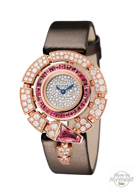 | More characteristics : | Movement Bulgari personalised quartz movement, adorned with the Bulgari logo (B033) Case 18kt pink gold case set with 79 brilliant-cut diamonds (~1.38 ct), 30 baguette-cut rubellites (~1.06 ct) and 1 rubellite (~1.02 ct) Dial Snow-set with 116 brilliant-cut diamonds (~0.26 ct) Strap Brown satin strap with 18ct pink gold pin buckle set with 20 brilliant-cut diamonds (~0.33 ct) |