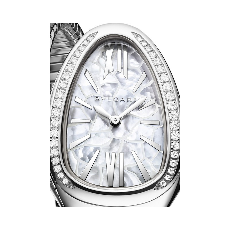 The very first artistic collaboration on the Serpenti Tubogas collection celebrates the fleeting splendor of nature, a theme dear to Japanese architect Tadao Ando. Green aventurine, tiger’s eye, and either white or pink mother of pearl – the watch face of Bvlgari’s iconic reptile expresses the changing hues of a forest across the seasons.