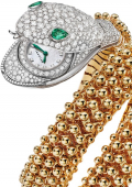With the exquisite rustling of myriad gold beads and a cascade of diamonds, the talismanic serpent embraces the skin in a voluptuous sweep. Behind hypnotic emerald eyes, hidden within its dazzling head, playful hours become a tender secret, like a promise of eternity.