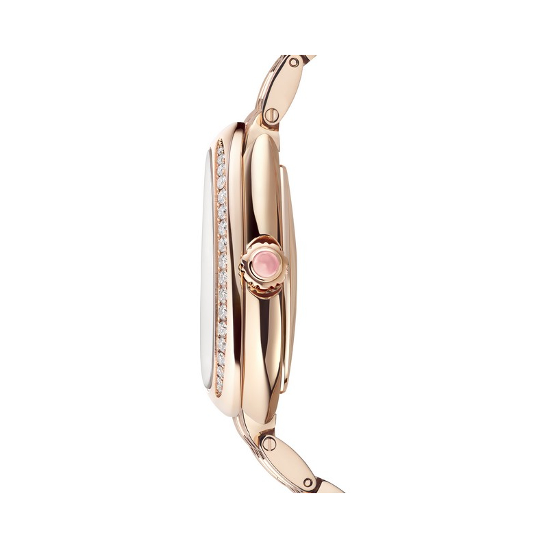 A cabochon-cut pink rubellite crowns the case, mirroring the rose gold-plated hands and indexes. The rose gold case with rose gold bezel set with 36 round brilliant-cut diamonds.