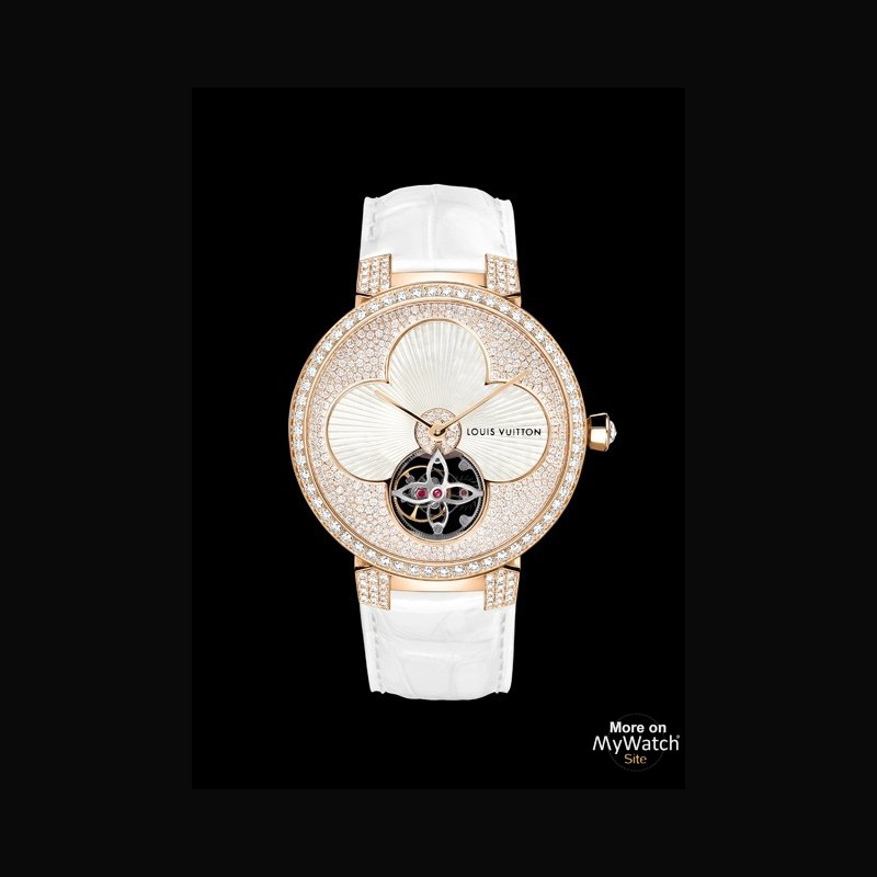 | More characteristics : | Movement Automatic movement. LV80 calibre. La Fabrique du Temps Louis Vuitton Functions: Tourbillon. hours & minutes Diameter: 28mm (12.5’’) Thickness: 5.87 Number of components: 151 Power reserve: 35 hours Oscillations: 28 800 per hour Number of rubies: 28 Oscillating weight in 18-carat pink gold Case in 18-carat pink gold Bezel set with 58 diamonds (1.1 ct) Cown set with 1 diamond (0.16 ct) Horns set with 48 diamonds (0.46 ct) Dial Sunray guilloché white mother-of-pearl and 386-diamond snow setting (0.94 ct) Semi-shiny white alligator strap Pin buckle in 18-carat pink gold set with 103 diamonds (0.93 ct) |