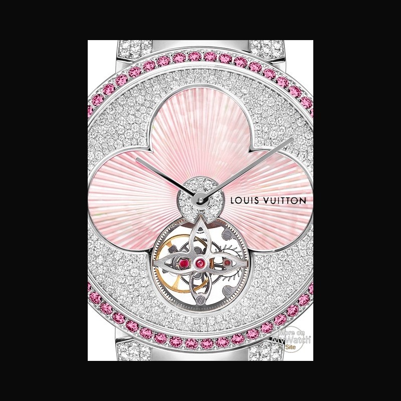 | More characteristics : | Movement Automatic movement. LV80 calibre. La Fabrique du Temps Louis Vuitton Functions: Tourbillon. hours & minutes Diameter: 28mm (12.5’’) Thickness: 5.87 Number of components: 151 Power reserve: 35 hours Oscillations: 28 800 per hour Number of rubies: 28 Oscillating weight in 18-carat pink gold Case in 18-carat rhodium-plated white gold Bezel set with 58 pink sapphires (1.2 ct) Crown set with 1 diamond (0.16 ct) Horns set with 48 diamonds (0.46 ct) Dial Sunray guilloché white mother-of-pearl and 386-diamond snow setting (0.94 ct) Semi-shiny fuchsia alligator strap Pin buckle in 18-carat white gold set with 103 diamonds (0.93 ct) |