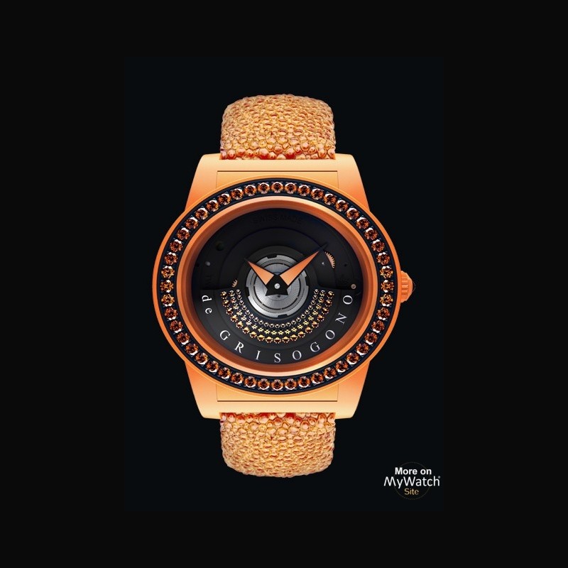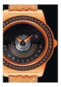| More characteristics : | Movement Jewels: 24 Power reserve: 42 Hours Reversed oscillating weight Case Orange Pearly photoluminescent composite Fiberglass Black PVD coated steel bezel set with 48 orange sapphires 1.57 ct Crown in orange PLF set with 1 black diamond 0.10 ct Dial Blackened reversed oscillating weight Set with 60 orange sapphires 0.29 ct Strap Orange Galuchat Folding clasp in steel with black PVD coating and orange PLF |