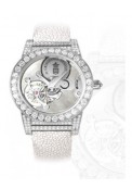 | More characteristics : | Movement Manual Tourbillon at 8 o'clock Hour and minute display in the centre Power reserve : 72 hours 19 jewels Thickness : 5.7 mm Horizontal diameter : 31.5 mm Vertical diameter : 28.8 mm Case White gold XL sized fully paved with white diamonds (side case included) 469 white diamonds of 4.2 carats Bezel set with white diamonds of 3.5 carats Crown set with a black diamond of 0.1 carat Interhorn space : 20.0 mm Dial Dial : 30.9 x 28.2 mm Plate coated with white mother-of-pearl Buckle in white gold set with 140 white diamonds of 0.84 carat Weight Case: 82 g Buckle: 33 g |