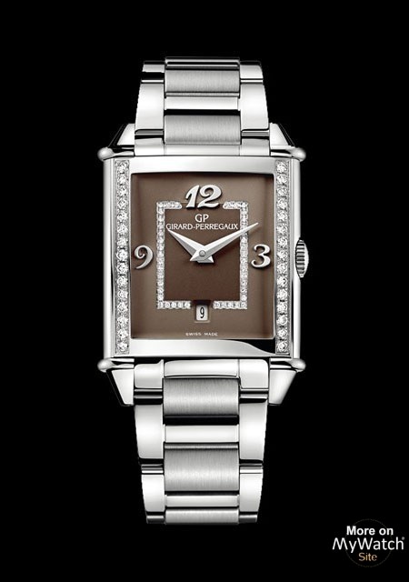 | More characteristics : | Girard-Perregaux movement GP02700-0003 Diameter: 19.40 mm (8 3/4 ’’’) Thickness: 4.20 mm Frequency: 28’800 Vib/h - (4 Hz) Power reserve: min. 36 hours Jewels: 26 Functions: hour. minute. date Case in steel Case-back: sapphire crystal. secured by four screws Dial Two colors. brown lacquered Setting Bezel: 30 brilliant-cut diamonds ~ 0.55 ct Dial: 42 brilliant-cut diamonds ~ 0.105 ct Total setting: 72 brilliant-cut diamonds. ~ 0.655 ct Steel bracelet Folding buckle in steel |
